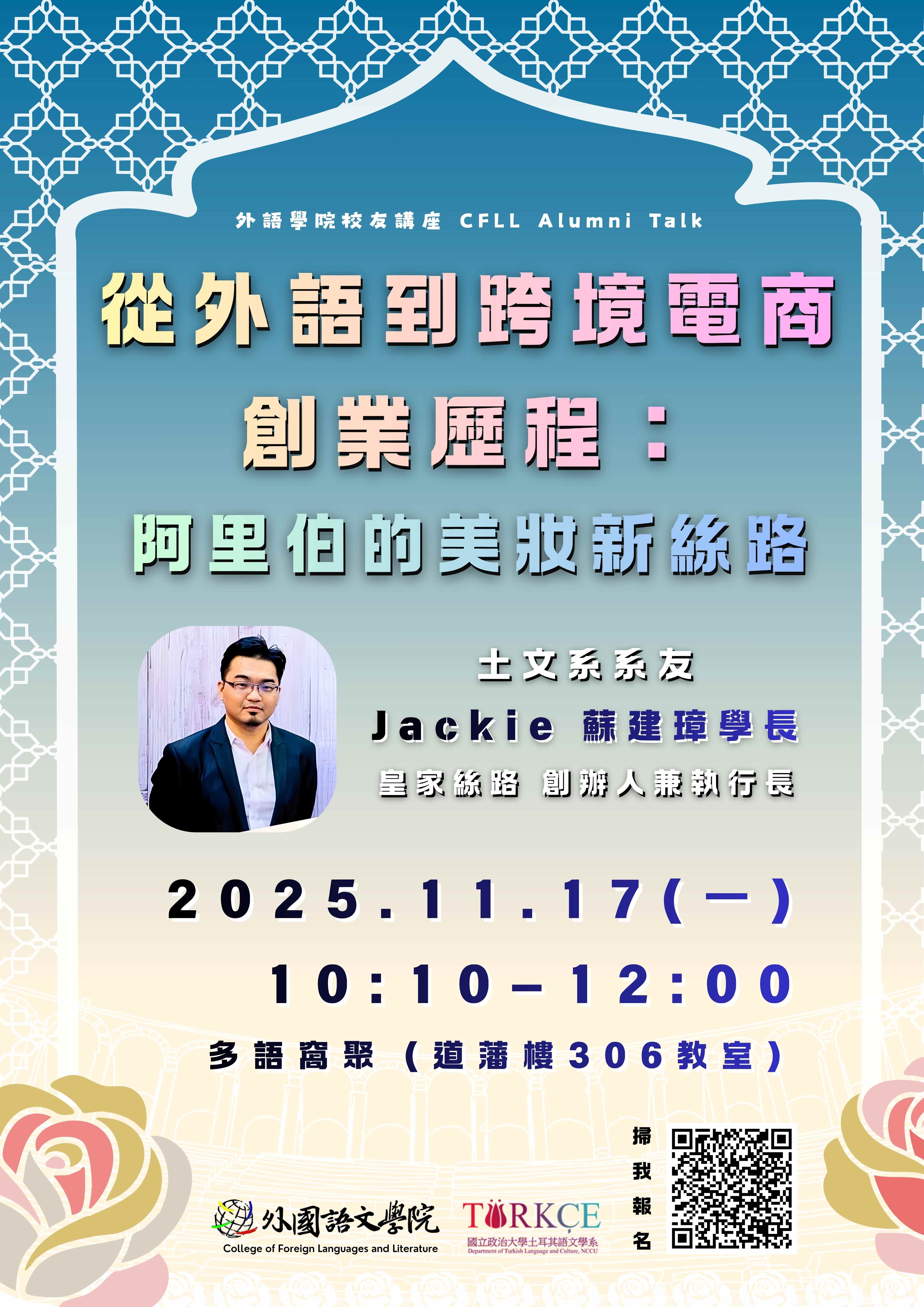 蘇建璋學長,土耳其文名字是Ali,同學們稱呼他Ali Bey,意思是指阿里先生。本次講座邀請學長以 「從外語到跨境電商創業歷程:阿里伯的美妝新絲路」為題,從自身經驗出發,分享學長如何從外語學科的背景,逐步跨足國際貿易與跨境電商領域,最終創立屬於自己的跨國美妝品牌,並成功進軍東南亞市場的創業歷程。